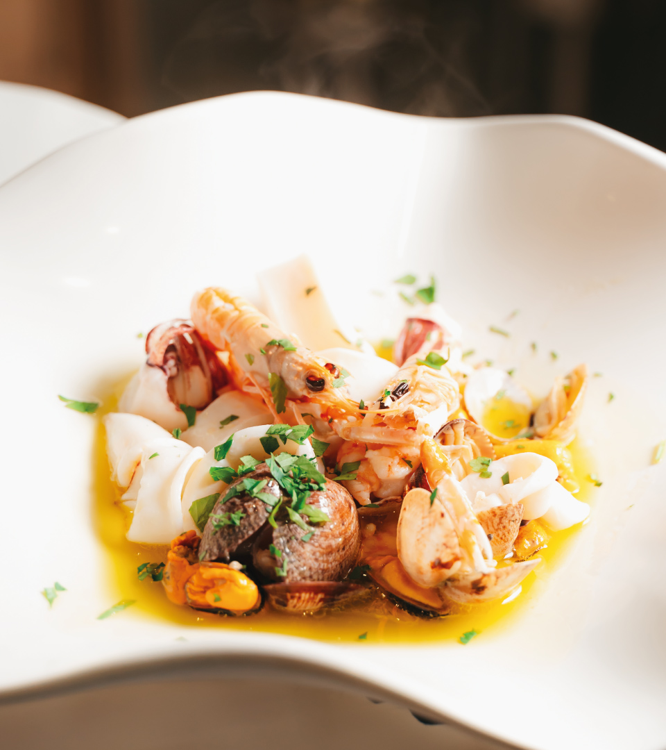 Pasta fresca con scampi, gamberetti, cozze, vongole, seppie, pomodorini e prezzemolo